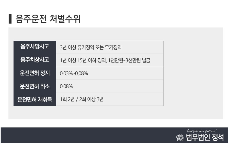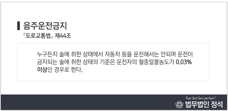 현행법상 본 사안에서 단속하는 처벌기준은 운전자의 혈중알코올농도 0.03%에서 그 수치에 따라 징역이나 벌금 등 형사처분이 달라집니다. 여기에서 실형 판결을 받을 뿐만 아니라, 동시에 면허 정지나 면허 취소 등의 행정 처분도 함께 받게 되는 것을 잊어서는 안됩니다만. 혈중 알코올 농도 0.03%는 술 한두 잔을 마셨을 때 나타나는 것이므로 결코 가볍게 보아서는 안 됩니다.