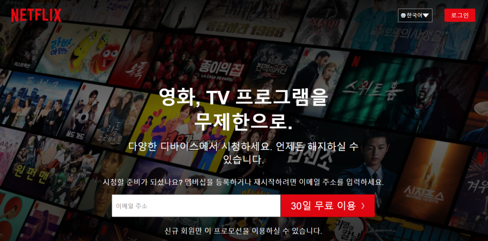 출처. https://www.netflix.com/kr/ 스마트TV, 태블릿, 스마트폰, PC, 게임 콘솔, 셋톱박스 등 인터넷 접속을 지원하는 다양한 기기와 접속하여 이용할 수 있다는 장점이 있으며 2010년 캐나다에서 스트리밍 서비스를 시작하여 해외 시장에 진출하였고 2011년부터는 자사가 직접 제작한 독점 콘텐츠를 공급하기 시작했습니다.