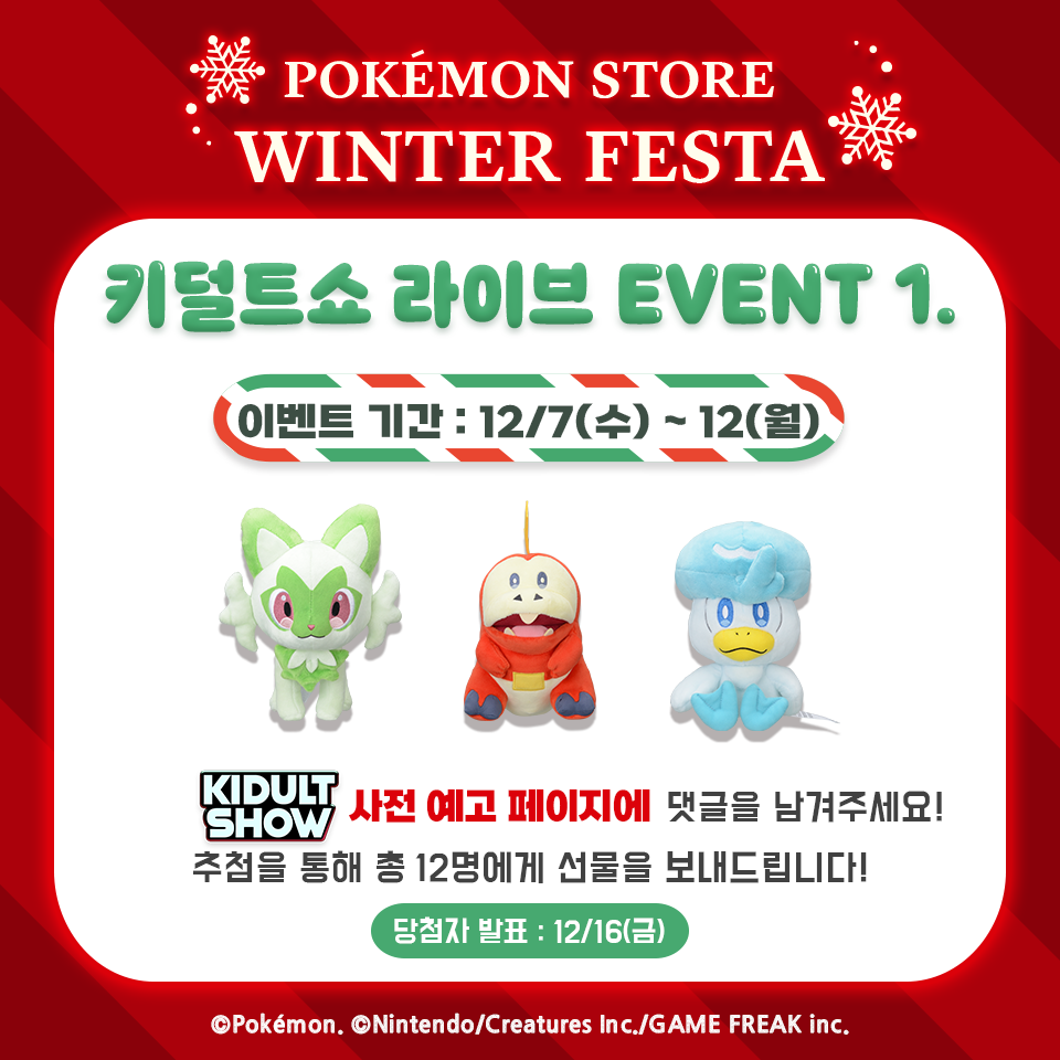 여기 사전 이벤트까지 진행되고 있어서요! 공지는 필수!!! 포켓몬과 함께 연말 마무리를 즐겁고 행복하게 해보는 건 어떨까요?!! 12월 13일 화요일 오후 8시 우리 모두 네이버 쇼핑 라이브 키덜트 쇼에서 함께해요!!! 본방사수!!!!