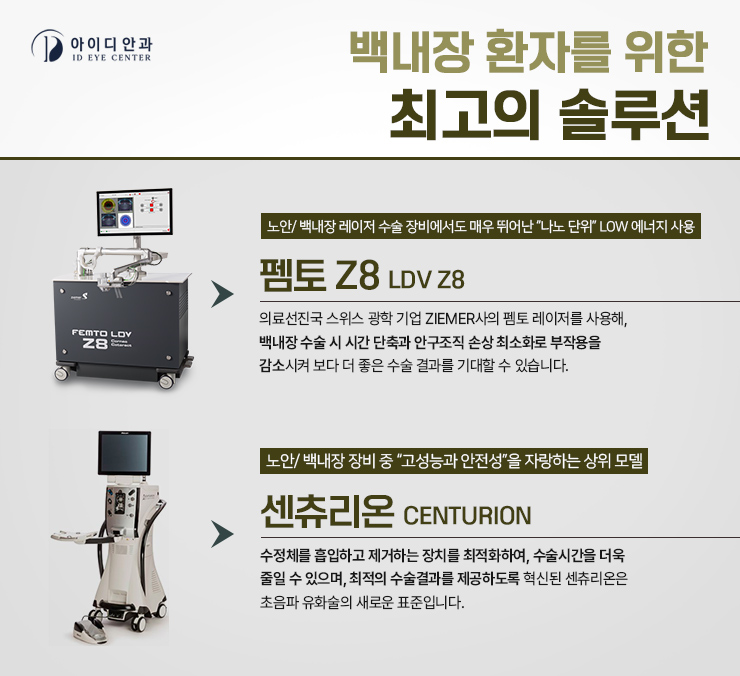 또한 센츄리온, 펨토 LDVZ8과 같은 노안 백내장 수술 장비를 활용하고 있어 수술 오차를 최소화하여 부작용과 후유증에 대한 걱정을 덜어주고 있습니다.