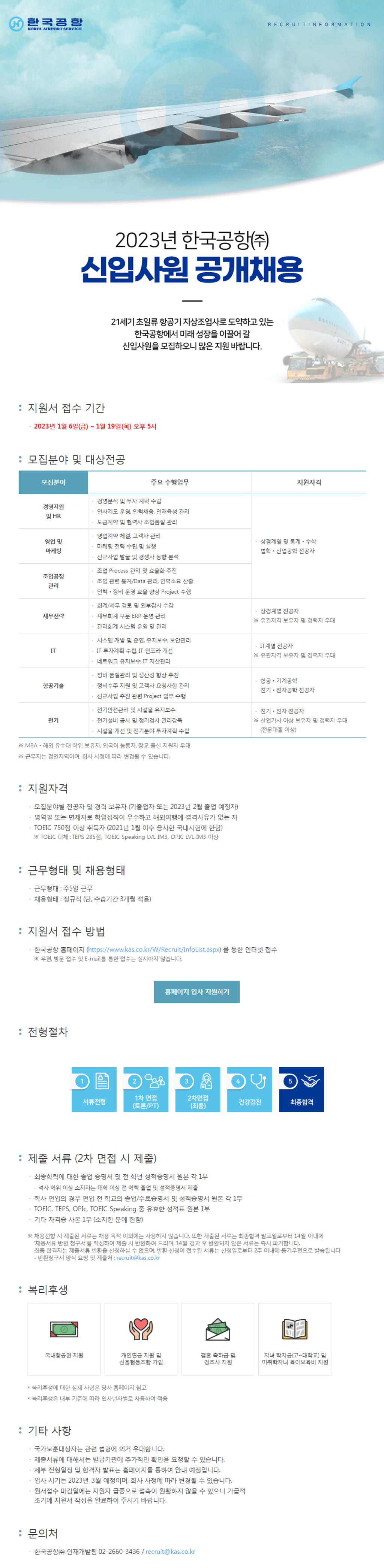 원서접수기간 2023년 1알 6일(금)~1월 19일(목) 오후 5시 모집분야 및 대상전공※ MBA·해외 유수의 대학 학위 보유자, 외국어 능력자, 장교 출신 지운자 우대※근무지는 경인지역이며 회사 사정에 따라 변경될 수 있습니다.지원자격·모집분야별 전공자 및 경력보유자(기졸업자 또는 2023년 2월 졸업예정자)·군복무필 또는 면제자로 학업성적이 우수하여 해외여행 결격사유가 없는 자·TOEIC 750점 이상 취득자(2021년 1월 이후 응시한 국내시험에 한함) ※TOEIC 대체:TEPS 285점, TOEIC Speaking LV LIM3, OPIC LV LIM3 이상 근무형태 및 채용형태: 정규직(단 수습기간 3개월·공항접수방법) 전형절차※ MBA·해외 유수의 대학 학위 보유자, 외국어 능력자, 장교 출신 지운자 우대※근무지는 경인지역이며 회사 사정에 따라 변경될 수 있습니다.지원자격·모집분야별 전공자 및 경력보유자(기졸업자 또는 2023년 2월 졸업예정자)·군복무필 또는 면제자로 학업성적이 우수하여 해외여행 결격사유가 없는 자·TOEIC 750점 이상 취득자(2021년 1월 이후 응시한 국내시험에 한함) ※TOEIC 대체:TEPS 285점, TOEIC Speaking LV LIM3, OPIC LV LIM3 이상 근무형태 및 채용형태: 정규직(단 수습기간 3개월·공항접수방법) 전형절차제출 서류(2차 면접 시에 제출)·학력에 대한 졸업 증명서 및 전 학년 성적 증명서 원본 각 1부-석사 학위 이상 소지자는 대학 이상의 전 학력 졸업 및 성적 증명서 제출·학사 편입의 경우 편입 전의 학교 졸업/수료 증명서 및 성적 증명서 원본 각 1부·TOEIC, TEPS, OPIC, TOEIC Speaking중 유효한 성적표 원본 1부·기타 자격증 사본 1부(소지한 분에 한한다.)※채용 전형 시에 제출된 서류는 채용 목적 이외는 사용하지 않아요. 또 제출된 서류는 최종 학력 발표일로부터 14일 이내에 “채용 서류 반환 청구서”를 작성하여 제출 때 반환하고 14일 경과 후에 반환되지 않은 서류는 즉시 파기됩니다. 최종 합격자는 제출 서류 반환을 신청하지 못하고 반환 신청이 접수된 서류는 신청일부터 2주간 아내에게 등기 우편으로 발송됩니다. -반환 청구서 양식의 요청 및 제출처:[email protected]기타 사항·국가 보훈 대상자는 관련 법령에 의거한 우대합니다.·제출 서류에 대해서는 발행 기관에 추가적인 확인을 요청할 수 있습니다.·전형 일정 및 합격자 발표는 홈페이지를 통해서 안내할 예정입니다.·입사 시가는 2023년 3월 예정인 회사의 사정으로 변경될 수 있습니다.·원서 접수 마감일에는 지원자 급증으로 접속이 원활하지 않은 경우가 있으므로 가급적 조기에 원서 작성을 완료하세요.문의처·한국 공항(주)인력 개발 팀 02 2660 34436/[email protected]제출서류(2차 면접시 제출)·최종학력에 대한 졸업증명서 및 전학년 성적증명서 원본 각 1부 – 석사학위 이상 소지자는 대학 이상의 전학력 졸업 및 성적증명서 제출·학사 편입의 경우 편입 전 학교 졸업/수료증명서 및 성적증명서 원본 각 1부·TOEIC, TEPS, OPIC, TOEIC, Speaking 중 유효한 성적표 원본 1부·기타 자격증 사본 1부(소지하신 분에 한함) ※채용전형시 제출된 서류는 채용목적 이외에는 사용하지 않습니다. 또한, 제출된 서류는 최종학력 발표일로부터 14일 이내에 ‘채용서류 반환청구서’를 작성하여 제출 시 반환하고, 14일 경과 후 반환되지 않은 서류는 즉시 파기합니다. 최종 합격자는 제출서류 반환을 신청할 수 없으며 반환신청이 접수된 서류는 신청일로부터 2주간 아내에게 등기우편으로 발송됩니다. – 반환청구서 양식 요청 및 제출처 : [email protected] 기타 사항 및 국가보훈대상자는 관련 법령에 의거 우대합니다.제출서류는 발행기관에 추가적인 확인을 요청할 수 있습니다.· 전형 일정 및 합격자 발표는 홈페이지를 통해 안내 예정입니다.·입사시가는 2023년 3월 예정이며, 회사 사정에 따라 변경될 수 있습니다.· 원서접수 마감일에는 지원자 급증으로 접속이 원활하지 않을 수 있으니 가급적 빠른 시일 내에 원서 작성을 완료해 주시기 바랍니다.문의처 한국공항(주)인력개발팀 02 2660 34436 / [email protected]