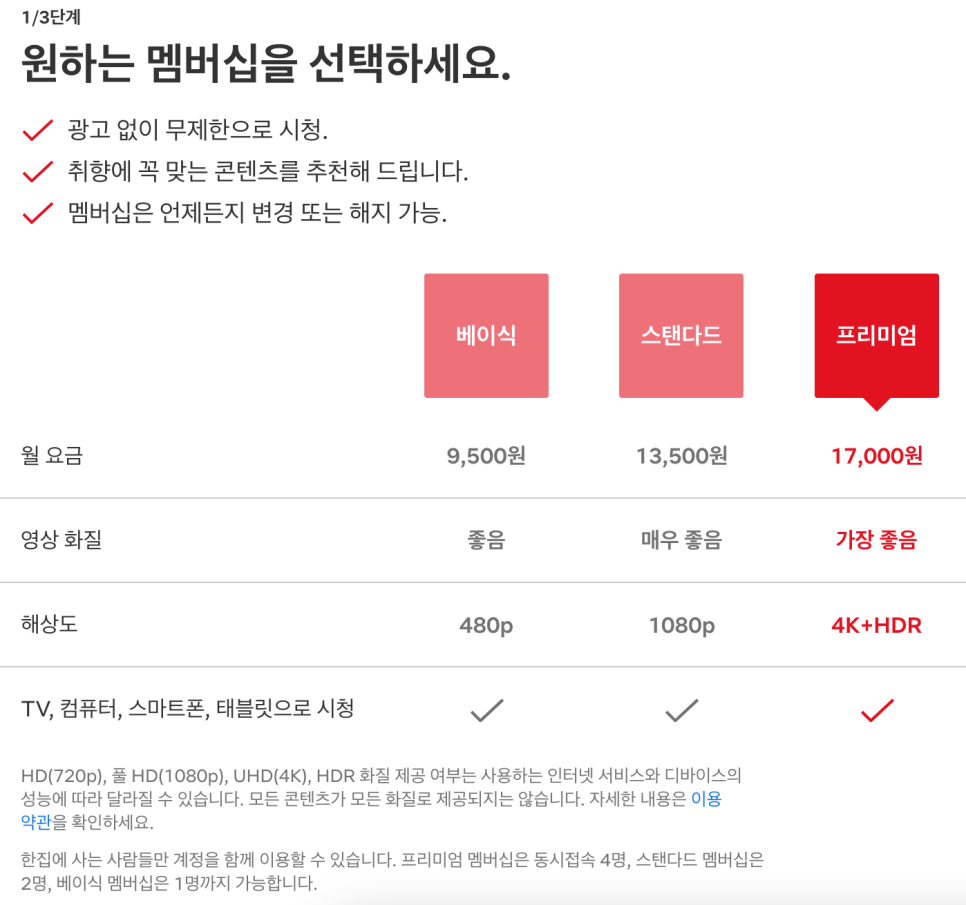 베이직 스탠다드 프리미엄 월 요금 95001350017000 영상화질 좋음 아주 좋음 가장 좋음 해상도 480p4K+HDR TV, 컴퓨터, 스마트폰, 태블릿 OOO 동시 접속 가능 수 124 최대 해상도 SDHD UHD(4K) 적정기기 모바일 태블릿, PCTVHD(720p), 풀HD(1080p), UHD(4K), HDR 화질에 따라 변할 수 있는지 여부는 사용 가능 여부