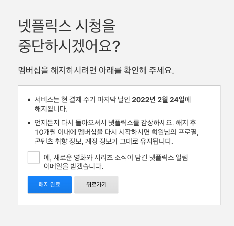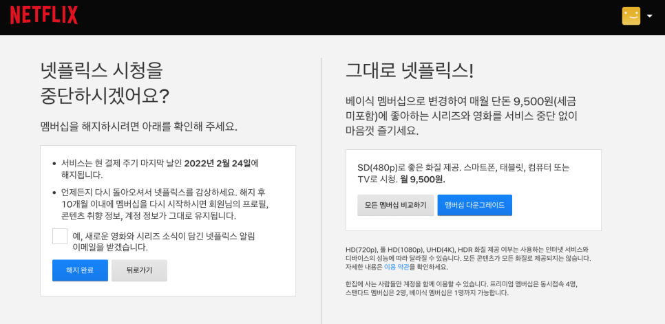 해지완료를 누르면 왜 해지했는지 간단한 설문조사를 받으면 완료됩니다.
