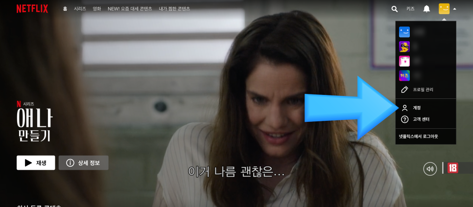 넷플릭스 해지 방법 넷플릭스 요금제 변경 방법 메인 화면에서 우측 상단의 탭을 눌러 [계정]에 접속합니다.