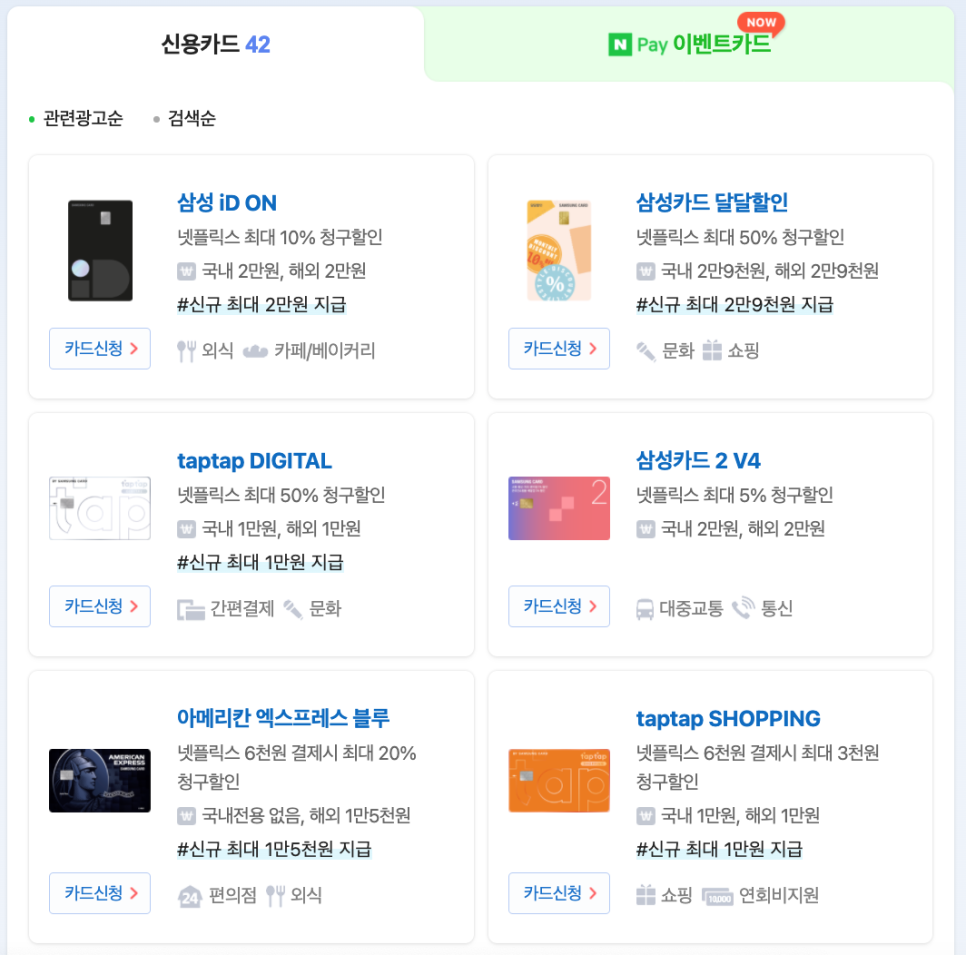 삼성iON은 넷플릭스 최대 10% 청구할인 taptap DIGTAL, 삼성카드 매월할인 최대 50% 청구할인 taptap SHOPPING 넷플릭스 6천원 결제시 최대 3만원 청구할인 삼성카드 2V4 넷플릭스 최대5% 청구할인 아메리칸익스프레스 블루넷플릭스 6천원 결제시 최대20% 청구할인 넷플릭스 시청기록 삭제 방법