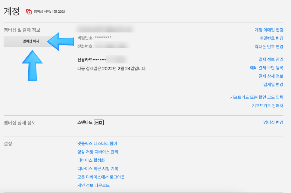 가격인상으로 멤버십 해지 또는 조금 더 낮은 요금제로 변경하시는 분들도 멤버십 해지 버튼을 눌러 변경 가능합니다.