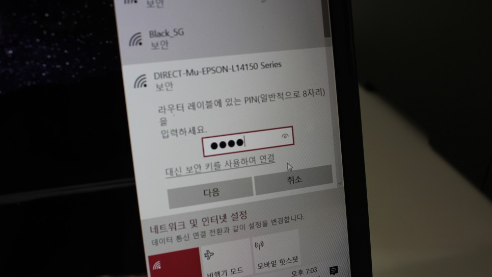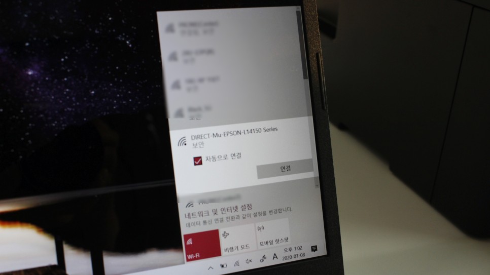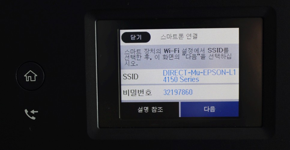 짜잔! 오른쪽 사진처럼 SSID를 누르고 비밀번호를 눌러 ‘다음’을 클릭하시면 됩니다. 그러면 이렇게 연결된 걸 확인할 수 있는데 인쇄창에 EPSON L14150 Series가 뜨는 게 보이네요. L14150을 클릭하시고 인쇄버튼을 누르시면 바로 출력되는 것을 확인하실 수 있습니다. 정말 간단하고 편리하죠?