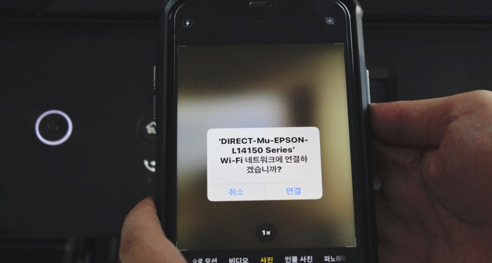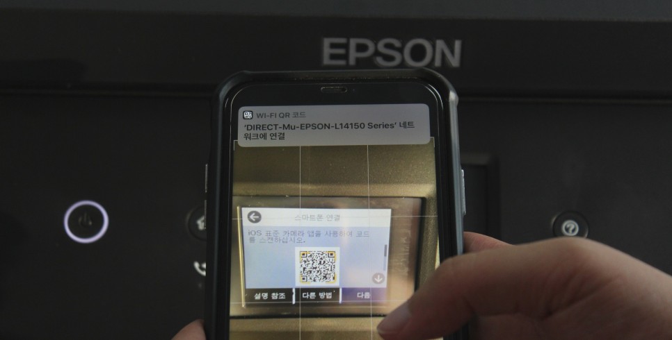 이와 같이, 기본 카메라로 QR 코드를 읽으면, 상부의 통지로 「L14150 네트워크 접속」이라고 하는 문구가 표시됩니다. 알림바를 클릭해 주시면 “네트워크에 접속하시겠습니까?” 라는 창이 다시 나타납니다. ‘연결’을 누르면 스마트폰과 잘 연결되었다는 메시지가 나타납니다. 그 이후로는 자유롭게 출력하면 끝~!