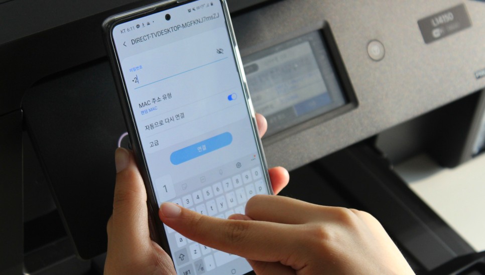 복합기 연결을 위해 휴대전화 ‘Wi-Fi’에 들어가 L14150 LCD 패널에서 확인한 SSID를 그대로 입력하면 손쉽게 연결 완료! 이때 ‘인터넷에 연결이 확실치 않다’라는 메시지가 떠요. 제대로 연결되도 좋으니 ‘Wi-Fi 연결유지’를 클릭하세요. 무선 출력을 위한 기본 세트는 끝! 그럼 본방에 돌입할까요?